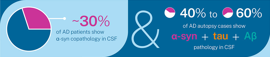 - CSF and plasma Aβ/tau assays and amyloid/tau PET remain the backbone for identifying AD-type pathology (Aβ and tau). Combining these AD biomarkers with αS-SAA results and/or with clinical signs increases confidence in recognizing mixed disease.4