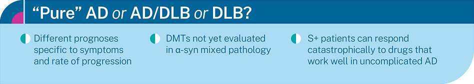 Takeaway: if an AD patient presents with well-formed visual hallucinations, marked fluctuations, parkinsonism, and/or disproportionate visuospatial impairment, consider testing for co-existing Lewy-type pathology. Understanding the underlying biology will allow for relevant counseling and precise management.1,2